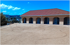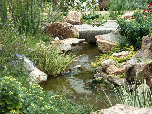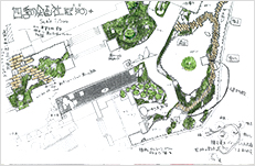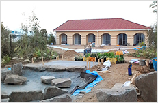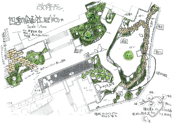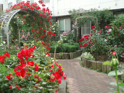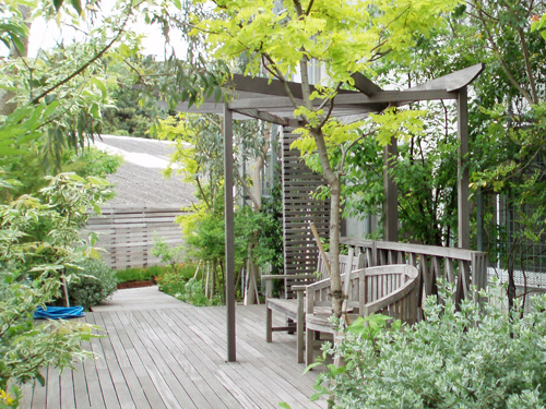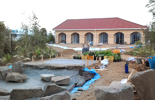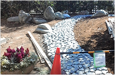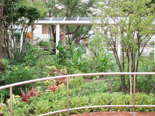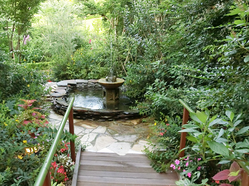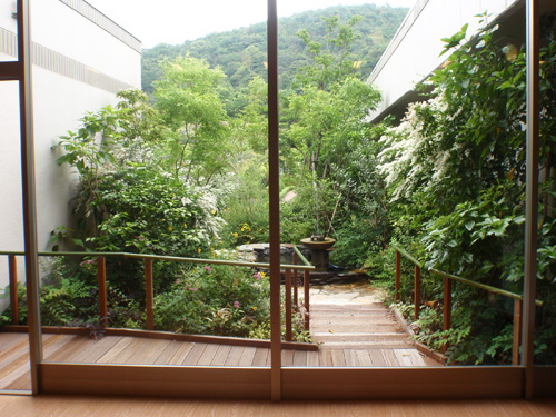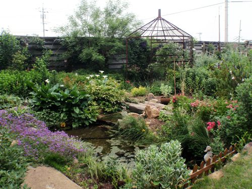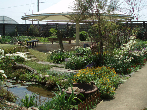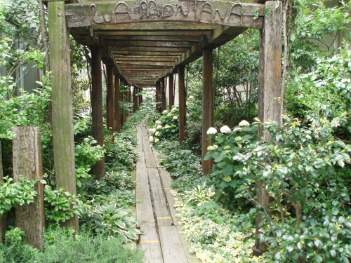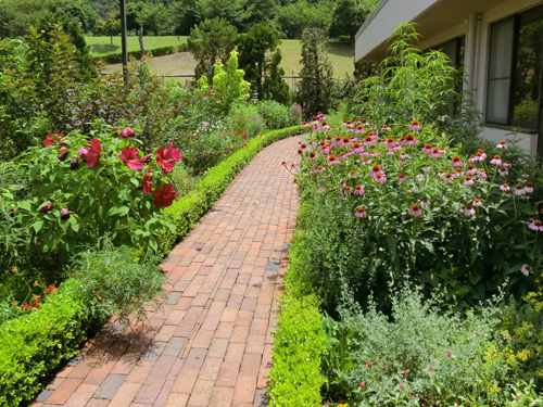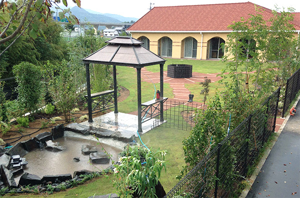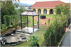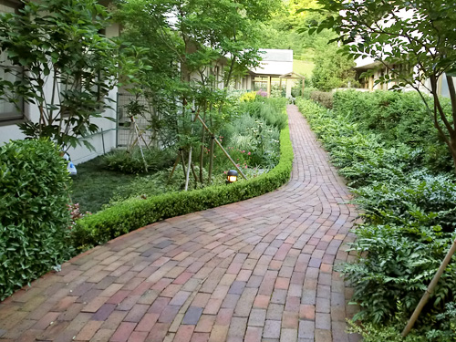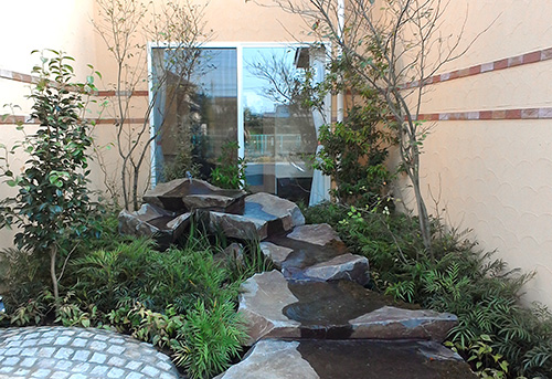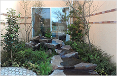 Through the arch way, there is the main garden with a beautiful creek. You can feel our company’s personality in many parts of this garden such as biotope, small hill, rose garden in the courtyard, railroad tie approach, gardens in many different styles, railroad tie flower bed and the beautifully paved walk way.