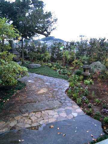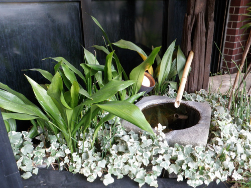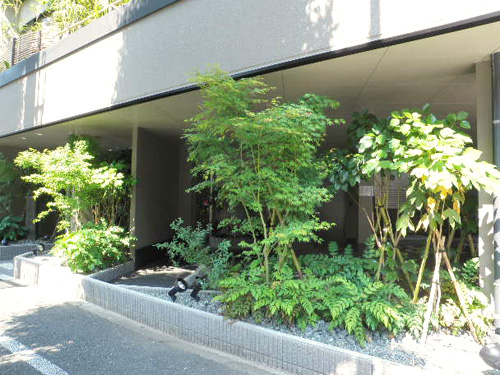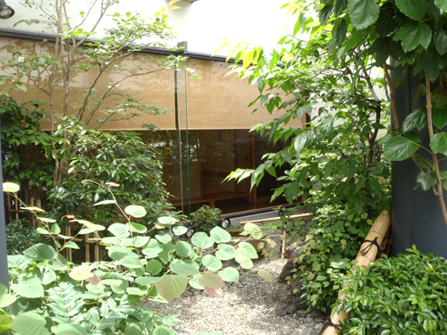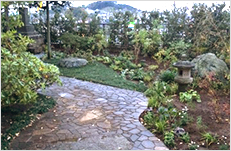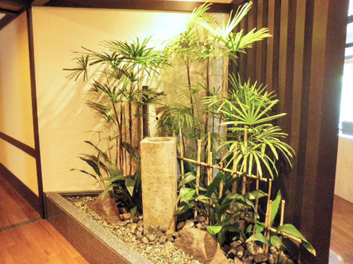 This stately garden was designed to seem bigger than its actual size by playing with the different elements, color, texture and the heights of the leaves. The stone lantern and the sound coming from the water bowl will give a dramatic feeling in this Japanese style garden at night. We designed and are doing regular maintenance.