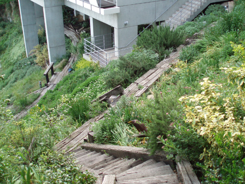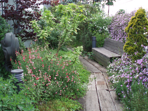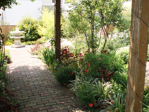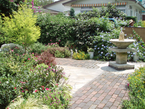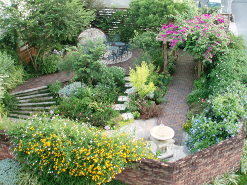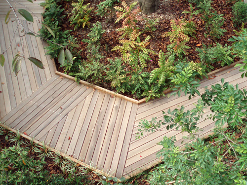 We built a high Asian Jasmine wall in the courtyard. This garden is also designed with a wood deck walk way in the warm soft sunlight and the paved walk way in railroad ties down to the beach. It will allow you to get lost in the beauty of the garden.