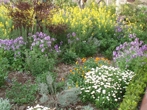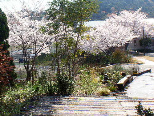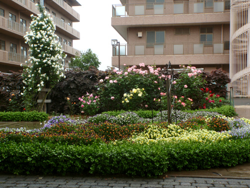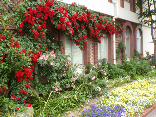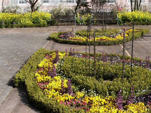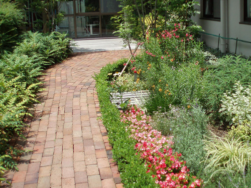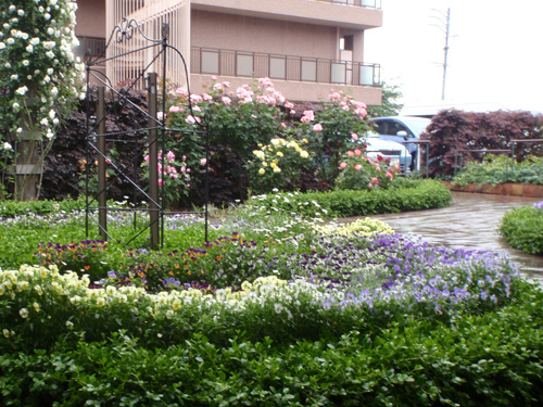 We planted seasonal flowers in a landscape and we built a lovely small garden beside of the entrance.