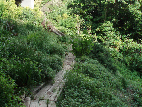 We repaired the path and the ground along the fence of this large garden and placed paving stones on the path and built a flower bed full of seasonal flowers.