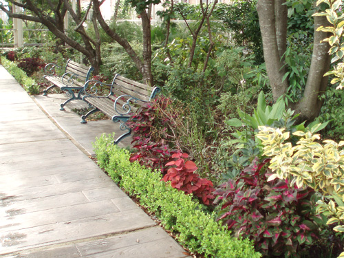 Brightly colored bougainvillea on the pergola will catch your eye. Square lots could seem smaller than the actual size. We made it seem like a bigger, comfortable private garden by manipulating peoples’ eyes and the power lines.